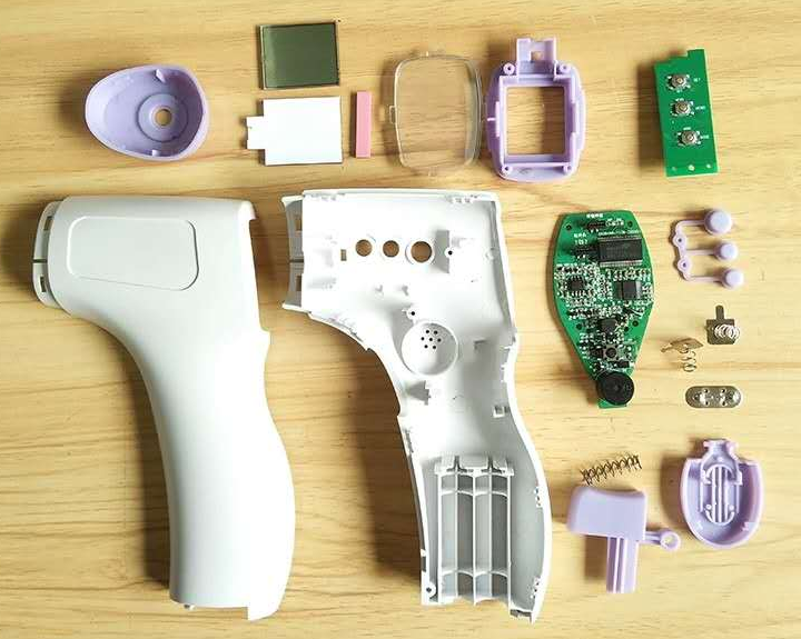 以上是 常規體溫槍的參數介紹,那么實現這些功能,基本需要各種零件來實現,測溫需要紅外感應電子器件,溫度的計算和顯示需要編程來時間,啟動和功能的切換需要按鍵來實現,下面看下體溫槍的拆解: