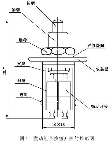 微動組合按鈕開關將兩個微動開關用鉚釘固定在支架部件上組合而成。在支架上鉚有套管,利用套管上的螺紋可將開關用螺母固定在安裝板上。