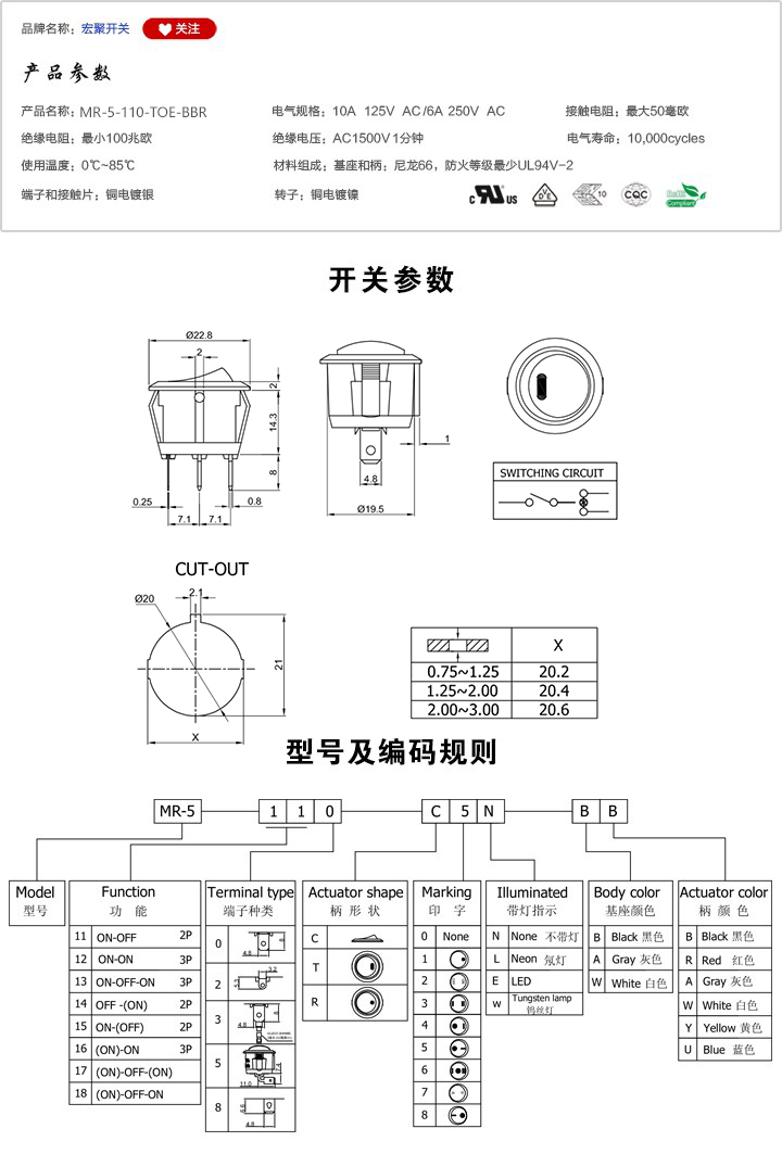東莞市宏聚電子五金制品有限公司成立于2005年,公司主要生產和研發船型開關、帶燈輕觸開關、按鍵開關、保險絲管座、電源插座等電子開關類產品。公司所有出口開關產品均通過 UL、CE、CQC、CCC 等多國安規認證。我公司己實施 ISO9001:2008管理模式并且取得相關證書,所有產品均有作過SGS環保檢測。